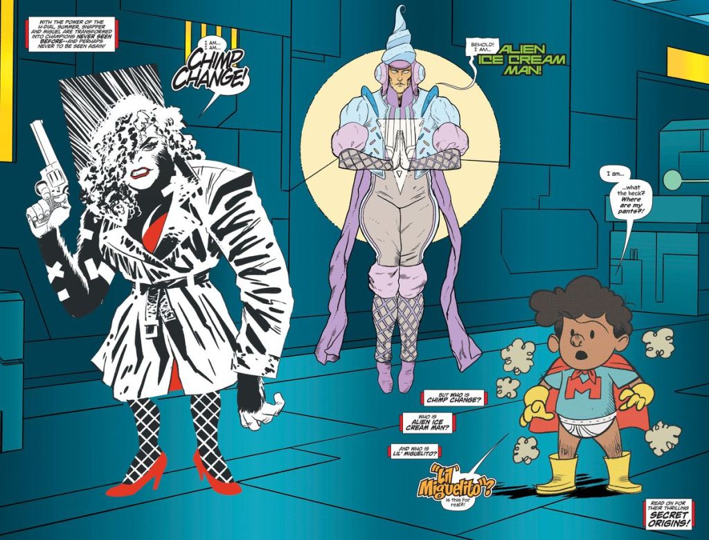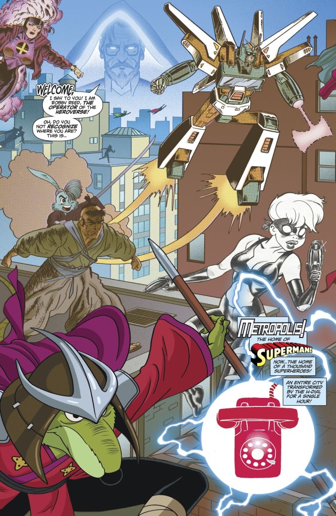 Issue 7 was a good example of the best of this comic series. The leading villain Mister Thunderbolt turns everyone in the multiverse into a super-hero(Starting with Metropolis), believing it to be some evolutionary next step and everyone can be the best thing they are. Everyone becomes some reference to comics as Miguel get’s lost in the Hero-Verse and deals with meta nonsense while Summer tries to take care of the situation in Metropolis.