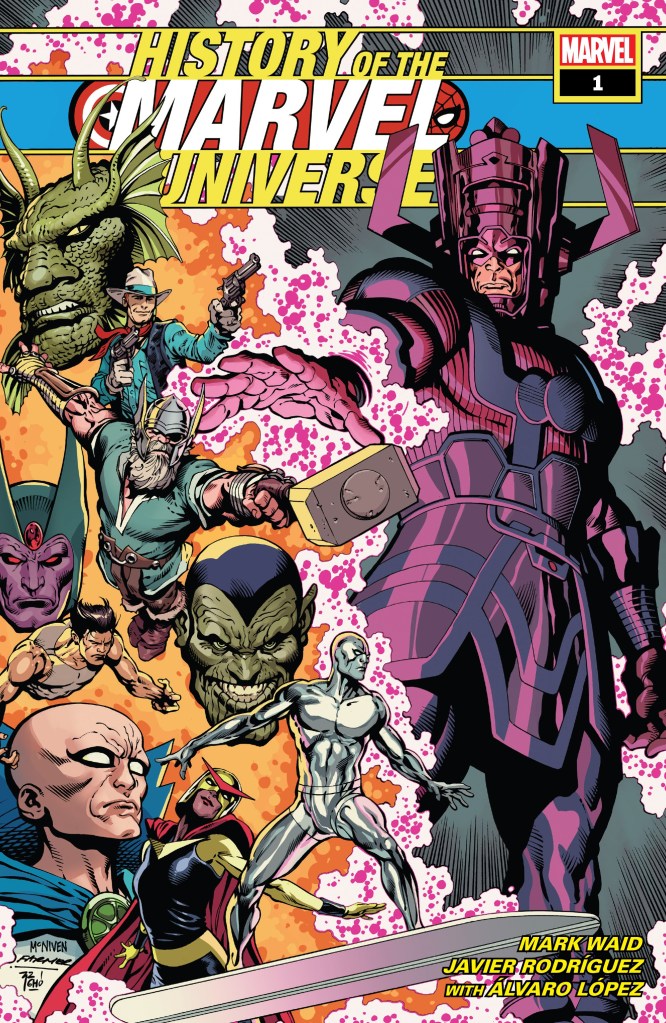 Waid is a good writer even if I think he’s a but of a nut, I loved his short Captain America run and Kingdom Come is still my favorite Comic ever as well as one of the first I read. History of the MU is a text book in which Franklin Richards and Galactus explain the timeline and history of the Marvel universe while they wait for the universe to end, connecting it all and even sourcing the materiel. I always thought that the face value history of the Marvel world was very interesting, more then DC who constantly rebooted it all. This Comic explains each moment in quick and easy text boxes and at the end get into details about what comics had this information for dumb nerds like me.